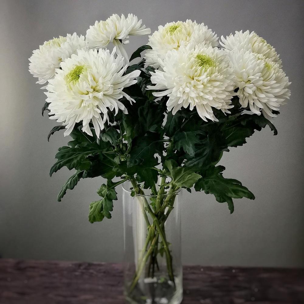 Перед установкой в вазу стебли следует подрезать острым ножом под углом. Используйте холодную воду, меняйте её ежедневно или доливайте при использовании цветочной подкормки. При правильном уходе белая хризантема долго сохраняет свежесть и форму. Рекомендуется использовать от 5 веток для создания сбалансированного букета.